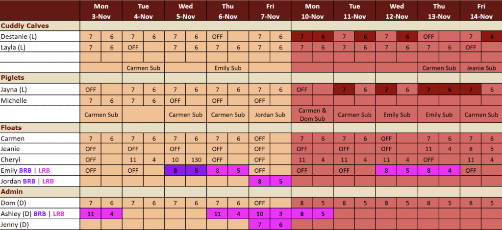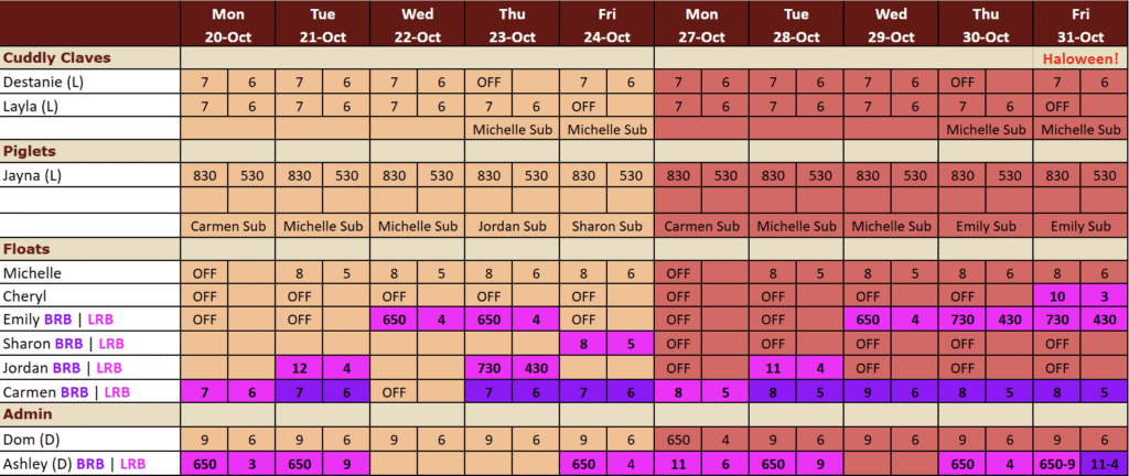 >> There have been way too many call outs this month. It has been rare lately that all of our staff show up and stay their whole shift. We understand that life happens and sickness happens, but if you can, please attempt to come to your shift and we can figure out a way to get you out early.